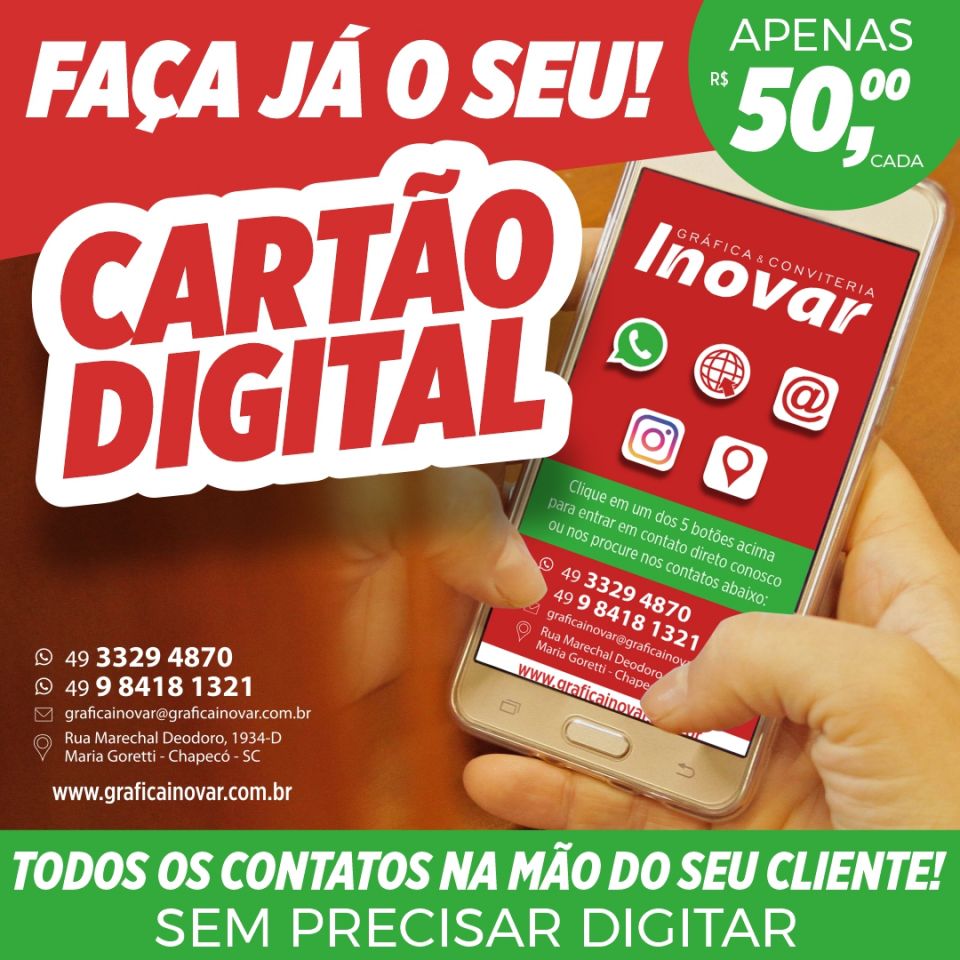 Cartão Interativo DigitalCartão de visita Brilho TotalCartão de visita com verniz localizadoCartão Brilho 4x0Cartão Brilho 4x4Cartão Brilho 4x4 2Cartão Verniz 4x0Cartão Verniz 4x4Cartão Verniz 4x4 2Cartão Verniz 4x4 3Cartão FidelidadeCartão Interativo Digital Você compartilha seu cartão e seu cliente vai ter acesso: endereço whatsapp telefones e-mail site loja online redes sociais tudo em um só lugar! Veja o nosso cartão interativo digital: acessando o pdf CartaoDigital_Inovar Cartão de visita Brilho TotalCartão de visita Brilho total 4x4 cores Cartão de visita Modelo Brilho total Cartão de visita Papel colche 300g Medidas 8,8 x 4,8 Laminação UV total Impressão 4x4 cores Cartão de visita com verniz localizado Cartão de visita Papel colche 300g Medida 8,8 x 5 Laminação Fosca + UV localizado Cartão Brilho 4x0 Cartão Brilho 4x4Cartão de visita Brilho total 4x4 cores Cartão de visita Papel colche 300g Medidas 8,8 x 4,8 Laminação UV total Impressão 4x4 cores Cartão Brilho 4x4 2 Cartão Verniz 4x0 Cartão de visita Papel colche 300g Medidas 8,8 x 4,8 Laminação UV total Impressão 4x0 cores Cartão Verniz 4x4 Cartão Verniz 4x4 2 Cartão Verniz 4x4 3 Cartão Fidelidade Cartão de visita Papel colche 300g Medidas 8,8 x 4,8 Laminação UV total Impressão 4x4 cores